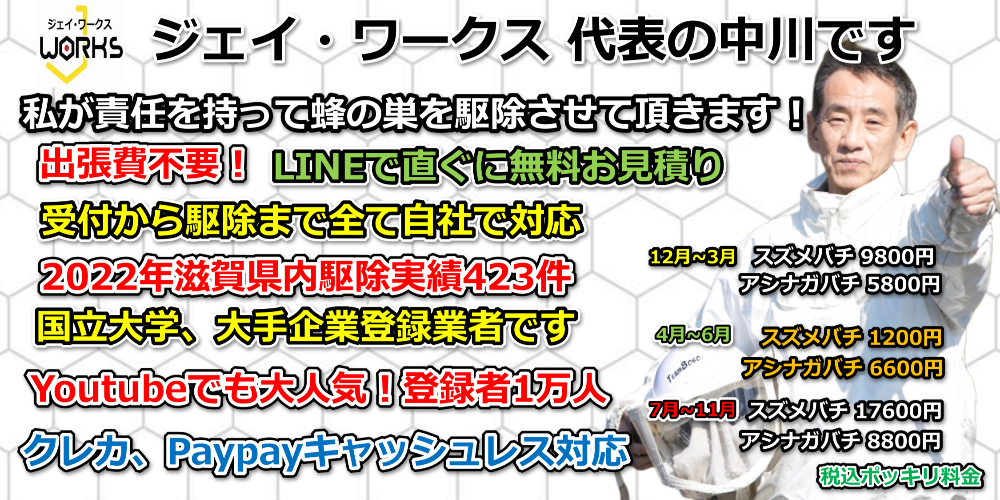 滋賀のハチ駆除「ジェイ・ワークス」は土日、祝祭日関係なく、年中無休で蜂(ハチ)の巣駆除に原則即日対応いたします。しかも、ポッキリ料金で安全確実、短時間で蜂(ハチ)の巣駆除を施工いたします!!さらに!施工後も安心な一ヶ月再発保証制度付!!
